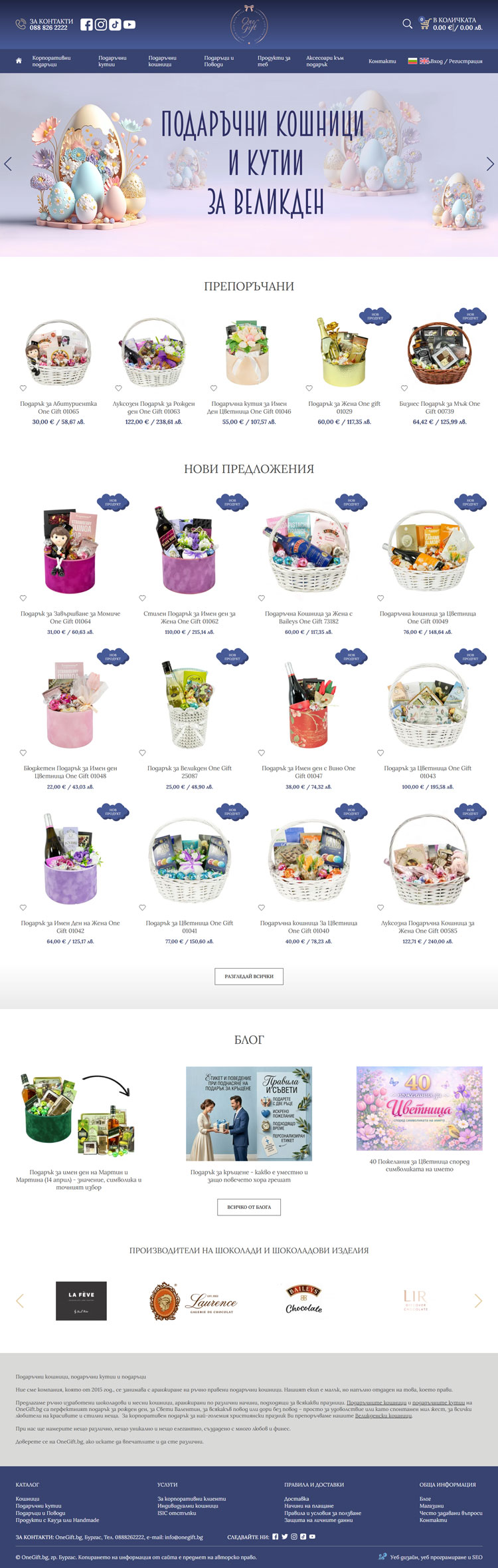 Нашият клиент OneGift.bg развива онлайн магазин, специализиран в подаръчни кошници, подаръчни кутии и подбрани предложения за различни лични и корпоративни поводи. Брандът се отличава с фокус върху ръчно аранжирани подаръци, елегантна презентация на продуктите и разнообразие от категории, насочени както към крайни клиенти, така и към бизнес аудитория.