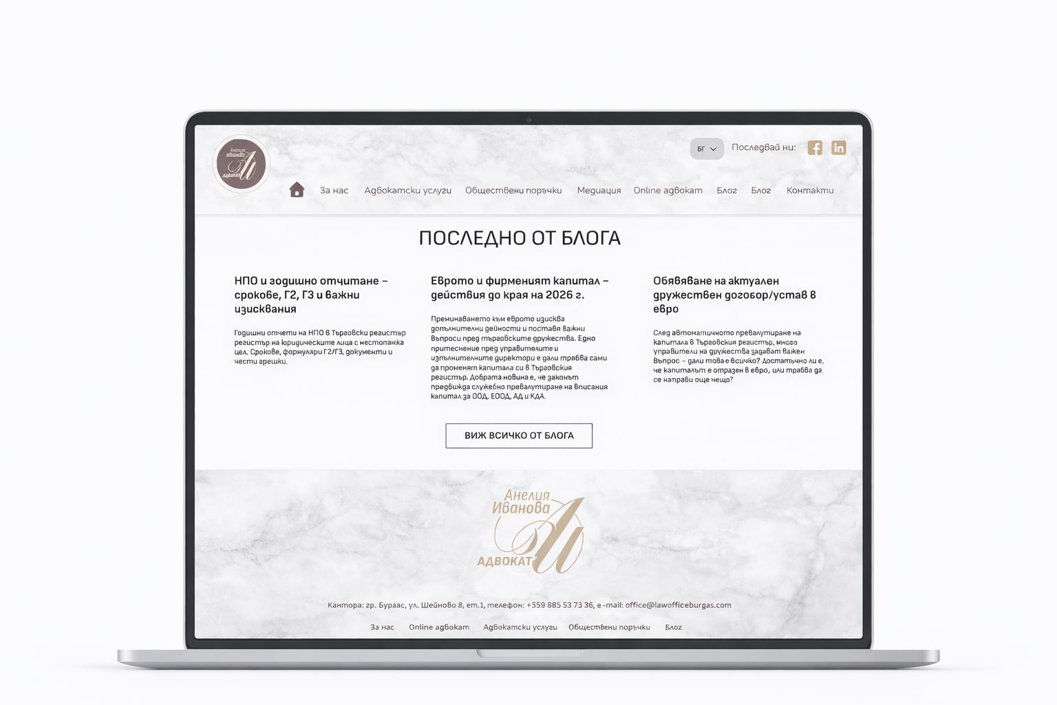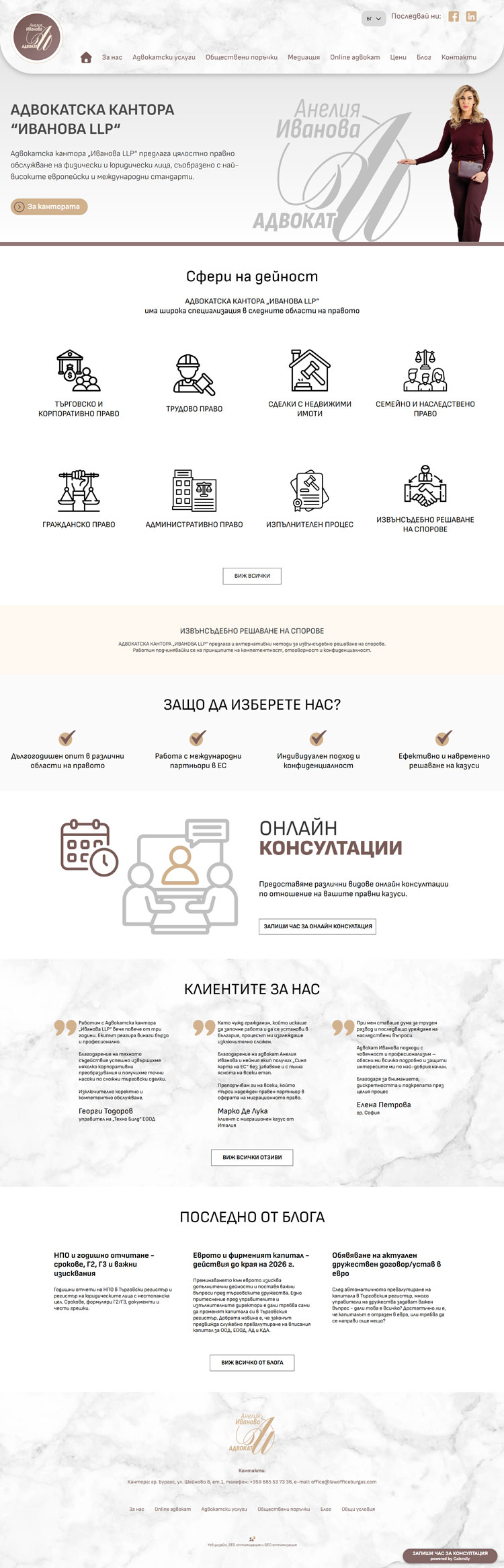 Lawofficeburgas.com е нов дигитален проект, изграден като представителен и работещ онлайн офис на Адвокатска кантора „Ivanova LLP“ в Бургас. Още от самата структура на сайта се вижда, че платформата е замислена като ясно организирана среда, в която потребителят може бързо да се ориентира между общата информация, специфичните адвокатски услуги, обществени поръчки, медиация, Online адвокат, блог и други.
