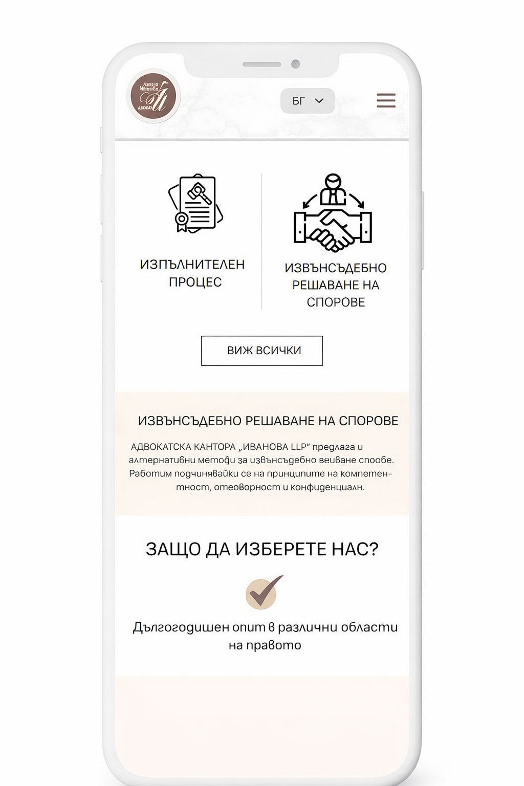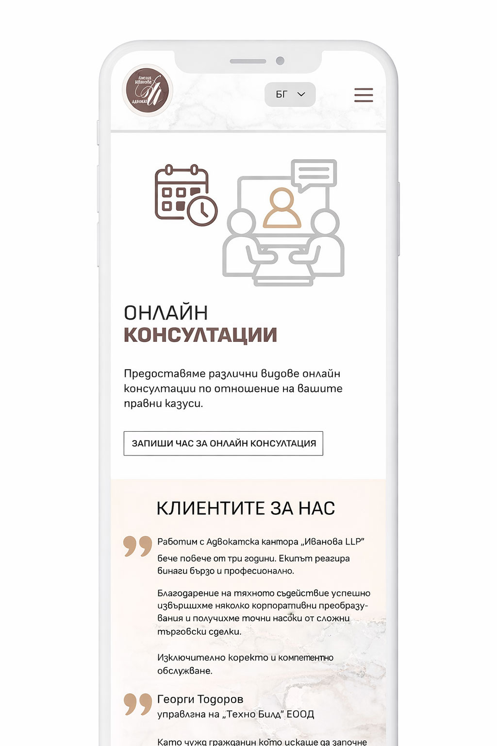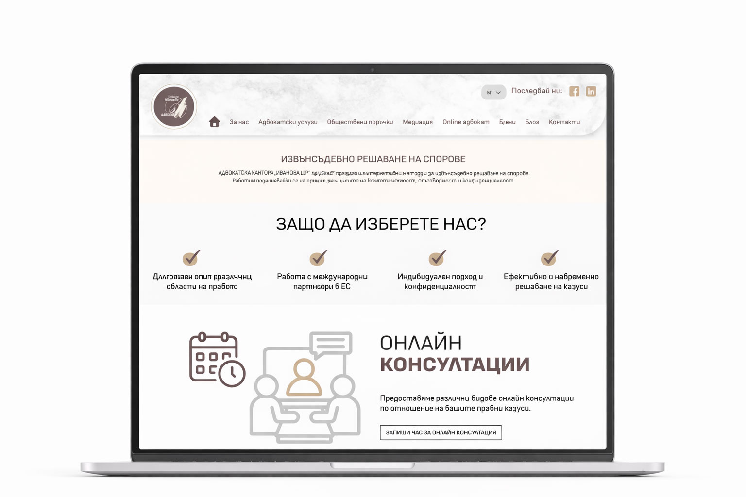 При работата по проекта за нас беше важно правната услуга да бъде представена в достъпна, ясна и съвременна онлайн форма. Затова изградихме уебсайт, който представя експертизата на кантората и улеснява реалния контакт с нея. Разделът Online адвокат е добър пример за това – чрез него консултациите могат да се заявяват и провеждат дистанционно по имейл, телефон, видеовръзка или чрез онлайн форма, което превръща сайта в реален канал за комуникация и заявка на правна помощ.